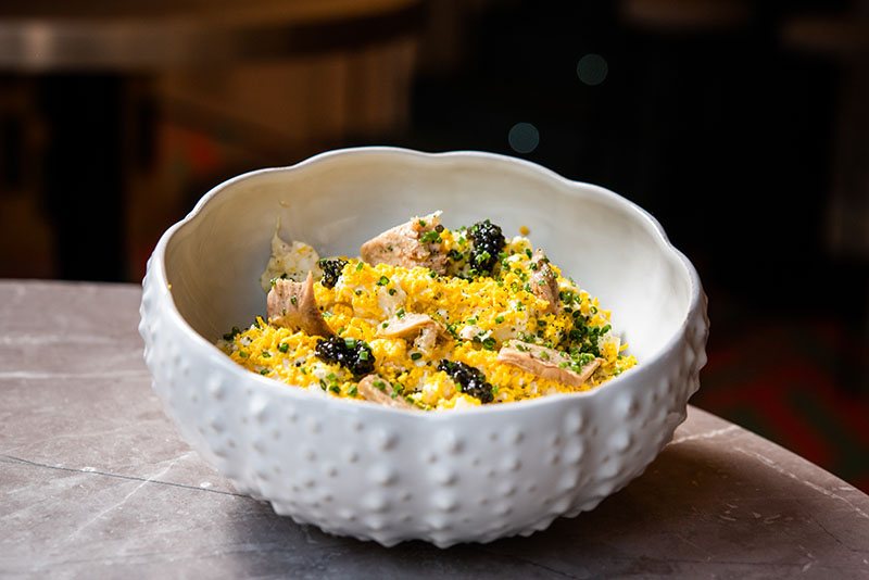 Es lo que ha aprendido en sus años de vivencias y experiencia, y lo que define la filosofía de este espacio como cocina tradicional actualizada de mercado. Las verduras que nutren su despensa las traen del huerto de la familia en Sesnández, Zamora, además de comprar productos locales basándose en la temporalidad para conseguir su sabor óptimo en cada momento. Eso se transmite en la hospitalidad que ofrece Madrid. Aquí todo el mundo es bien recibido. Su cocina es un como un pueblo grande donde la cecina de León va de la mano de los carabineros. El caviar puede acompañar a un bocado de atún o un trozo de molleja preparada en su punto… La vida es muy corta para no disfrutar en la mesa.