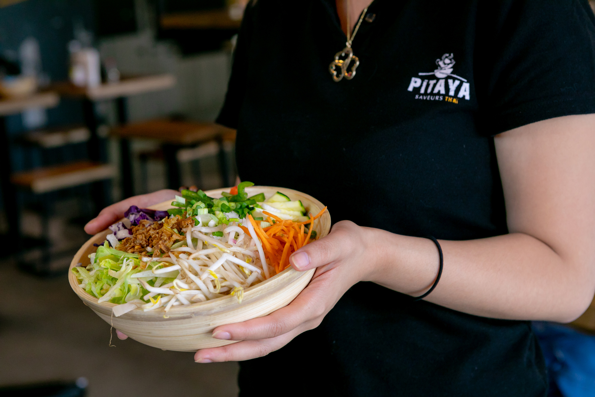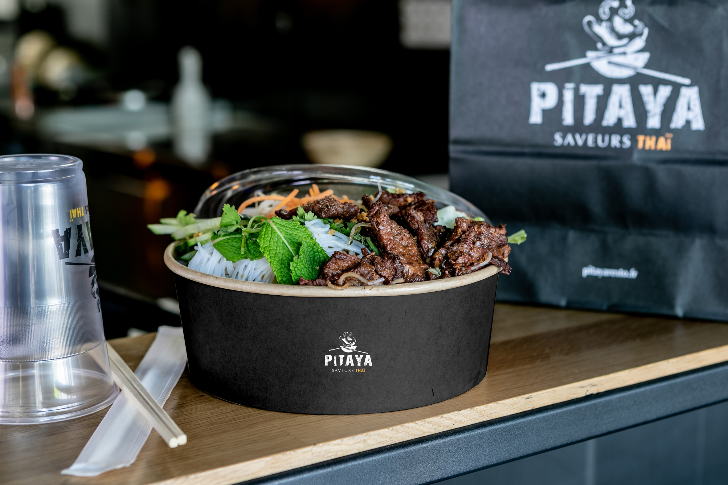 Su cocina es colorida, sencilla, generosa y sabrosa y se elabora con ingredientes naturales, en la medida de lo posible bio y sin gluten. Platos equilibrados y rápidos como el Bo Bun Thai, una ensalada fresca de verduras crujientes, vermicelli, ternera marinada a la citronela, salsa nuoc-mam de la casa y menta fresca el Nua Kao, un mar y montaña que es todo un símbolo gastronómico en Tailandia -gambas y ternera con arroz, verduras crujientes y cebolla frita- sus 3 woks de Curry -verde amarillo o rojo- el exótico Chicken Ananas, con tiras de pollo, salsa agridulce, dados de piña, verduras y arroz blanco tailandés o el archiconocido Pad Thai. También hay opción sin proteína animal, el Vegetarian Thai, con verduras crujientes salteadas y arroz y en el que, como en el resto de propuestas, no faltan las exclusivas salsas Pitaya. Se trata de platos únicos, contundentes, con los que se puede crear menús para adultos y niños (ambos con bebida y un postre -de inspiración asiática que no hay que perderse-) o añadir ingredientes o toppings extra. Tienen cervezas orientales y bebidas exóticas de la marca Foco, tés, agua de coco o zumos de lo más apetecibles.