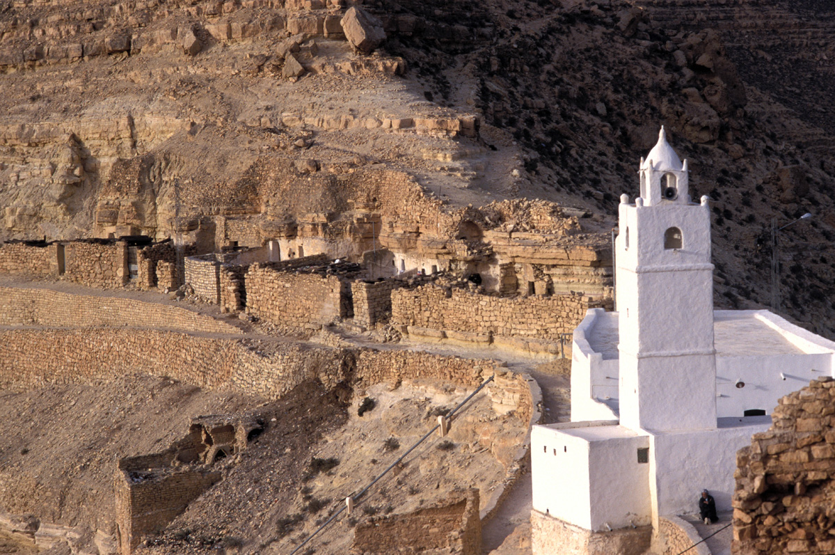 Cuando los árabes llegaron a estas áridas regiones al sur del gran lago salado, los bereberes se refugiaron hacia el sur y se construyeron sus poblados en las cimas inaccesibles, mientras que las tribus árabes y nómadas se instalaban en la llanura para asegurar los pastos a sus ganados. La inseguridad llevó a los bereberes a guardar sus cosechas en graneros fortificados, los ksour (en singular ksar), hechos a base de celdas abovedadas (las ghorfas) de 4 a 5 metros de profundidad y 2 m de alto que servían de silos.
