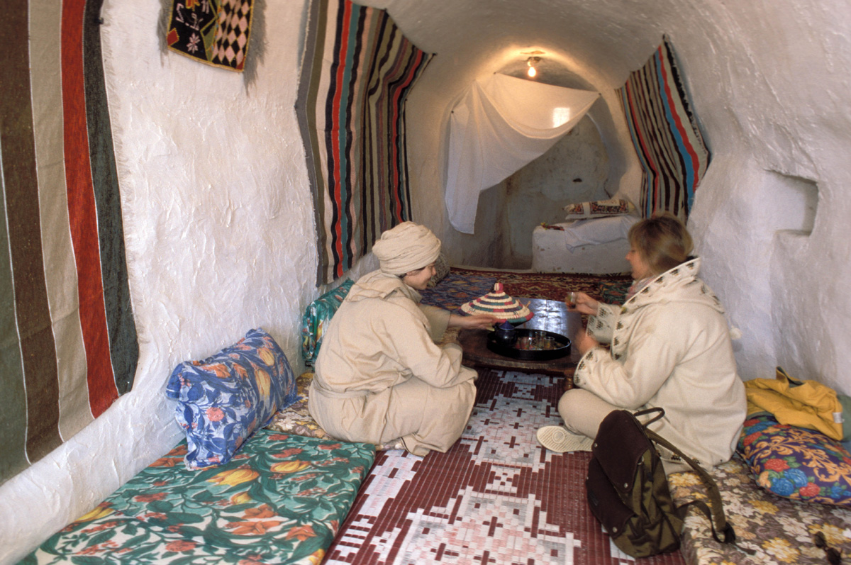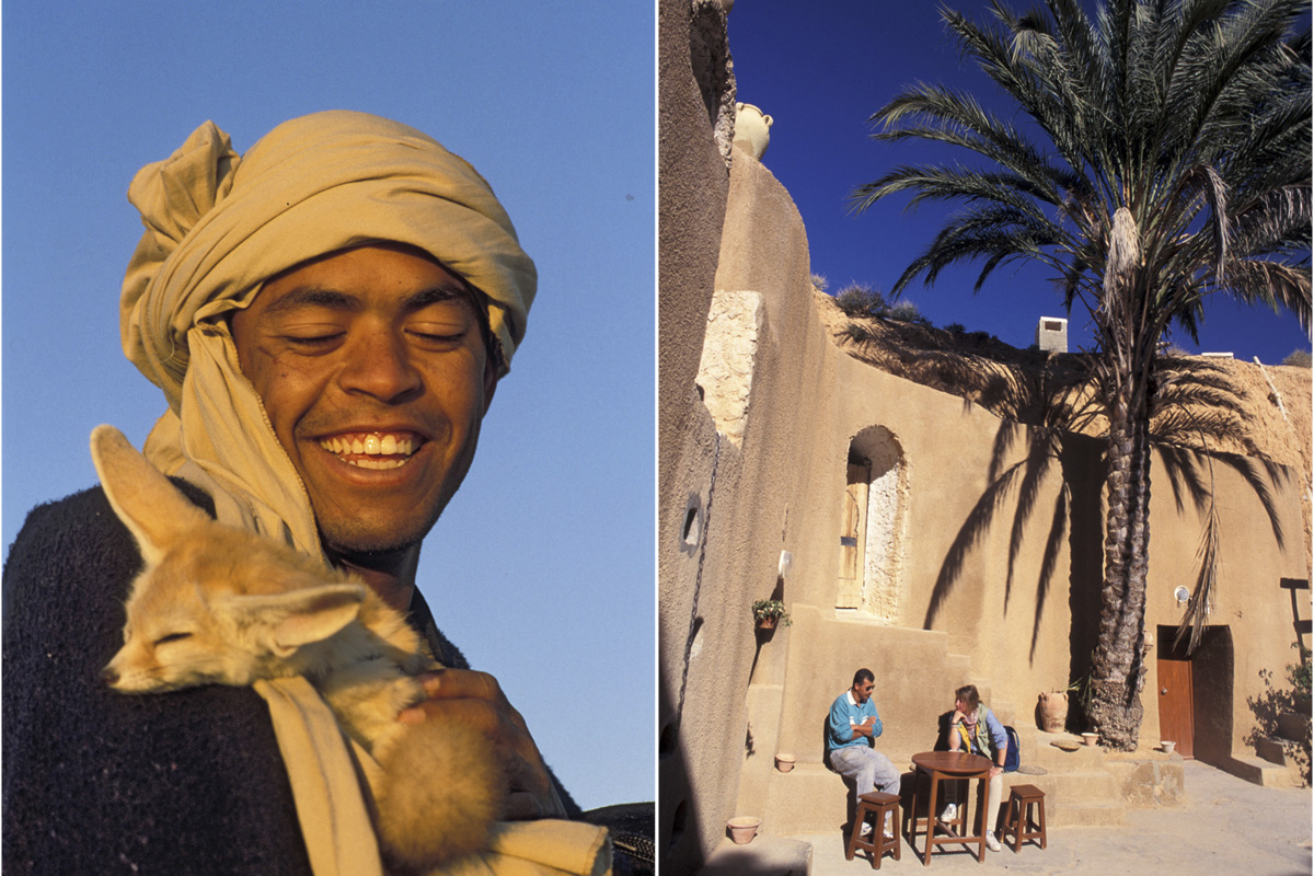 Algunos eligen Tataouine como punto de partida para otras excursiones, esta vez a los impresionantes pueblos trogloditas Douiret o Chenini, con habitaciones excavadas a más de diez metros de profundidad que ya sirvieron de refugio a los primitivos cristianos. En la pintoresca plaza con soportales de Tataouine se está celebrando el mercado cuando llegamos. Es fácil mezclarse con la gente y curiosear entre los vendedores de artesanía y de productos de uso cotidiano que reflejan el espíritu de esta región desértica donde los bereberes han conservado sus tradiciones y su artesanía.