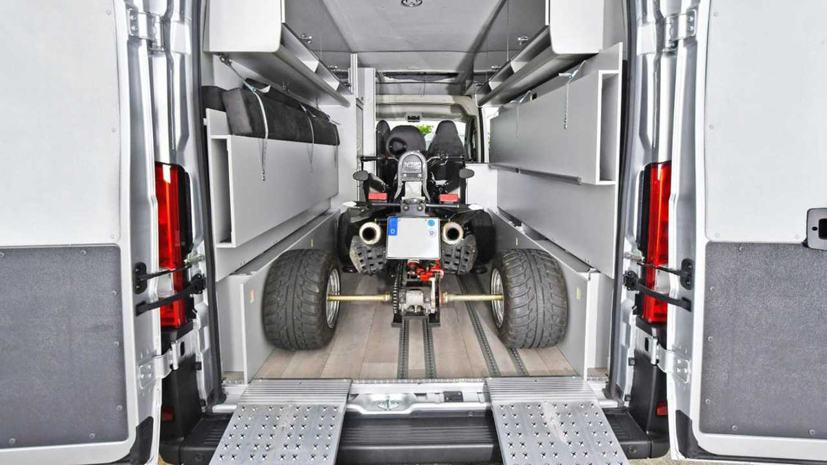 Gracias al preparador Flexebu, al vehículo se añade un dispositivo de carriles bien sujetos al chasis que permiten cargar y fijar bien las motocicletas, ya sean estas modestas scooters o motos de respetable potencia. Por supuesto, el transporte es totalmente seguro y todo está estudiado al milímetro. Un sistema de rieles y un cabestrante eléctrico permiten no forzar la espalda y bajar y subir los vehículos sin dañar ninguna carrocería, ni la de la Jumper ni la de las motos. Dentro, una vez en marcha, un sistema de soportes específicamente diseñado para el modelo permite sujetar las motos.