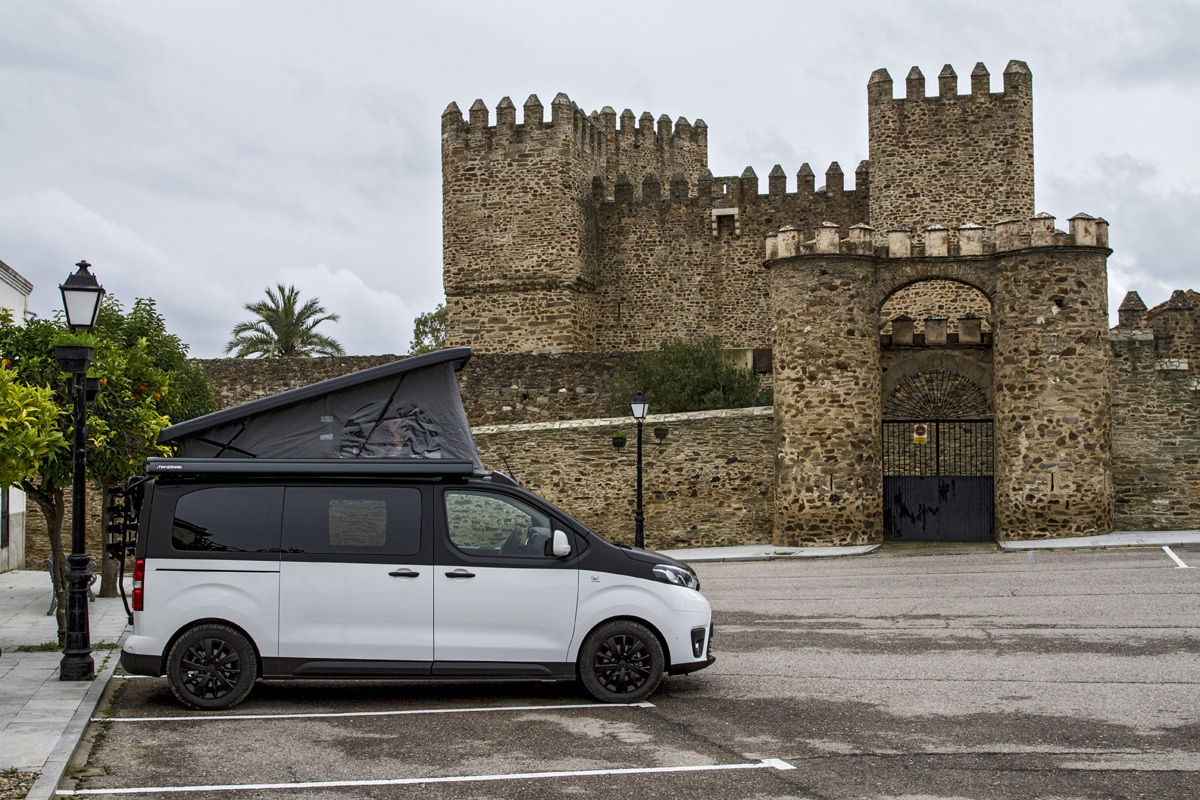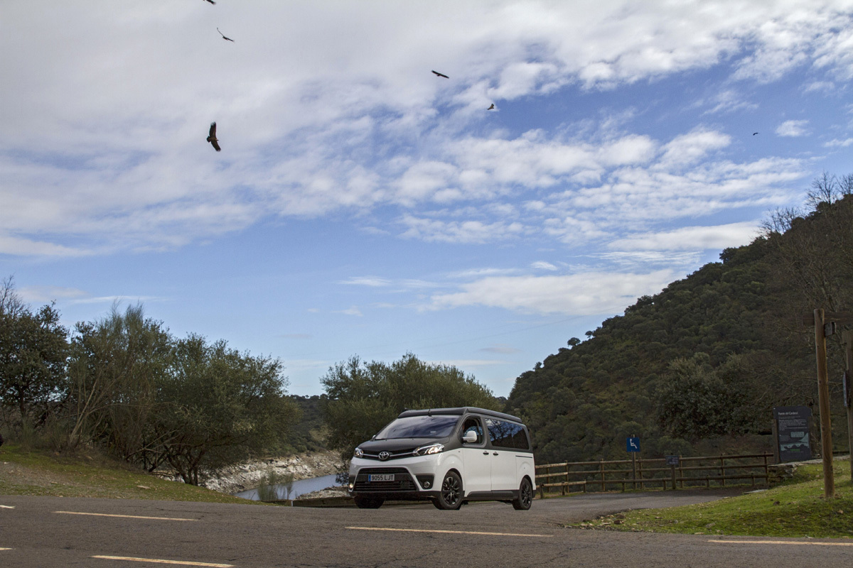El equipamiento marca la diferencia y es su valor añadido. Lo más espectacular es su techo elevable que una vez levantado sube la altura del vehículo hasta 2,5 metros. Solo requiere abrir una de las puertas o ventanas del Toyota y, mediante dos cierres delanteros con sistema de seguridad y otro sistema hidráulico que impulsa el techo hacia arriba, y ya tenemos una amplia cama adicional con tres ventanas, con mosquitera para evitar posibles visitantes voladores. La tela plegable de gran calidad nos aísla del exterior y a la vez proporciona con muy pocas maniobras una enorme cantidad de espacio adicional que casi multiplica por dos la habitabilidad de la Proace. Para la cama inferior solo hay que abatir las filas de asientos traseros, y para la cama superior bajar el falso techo cama para disfrutar del piso de arriba, que por cierto, incluye un flexo y una barrera protectora.