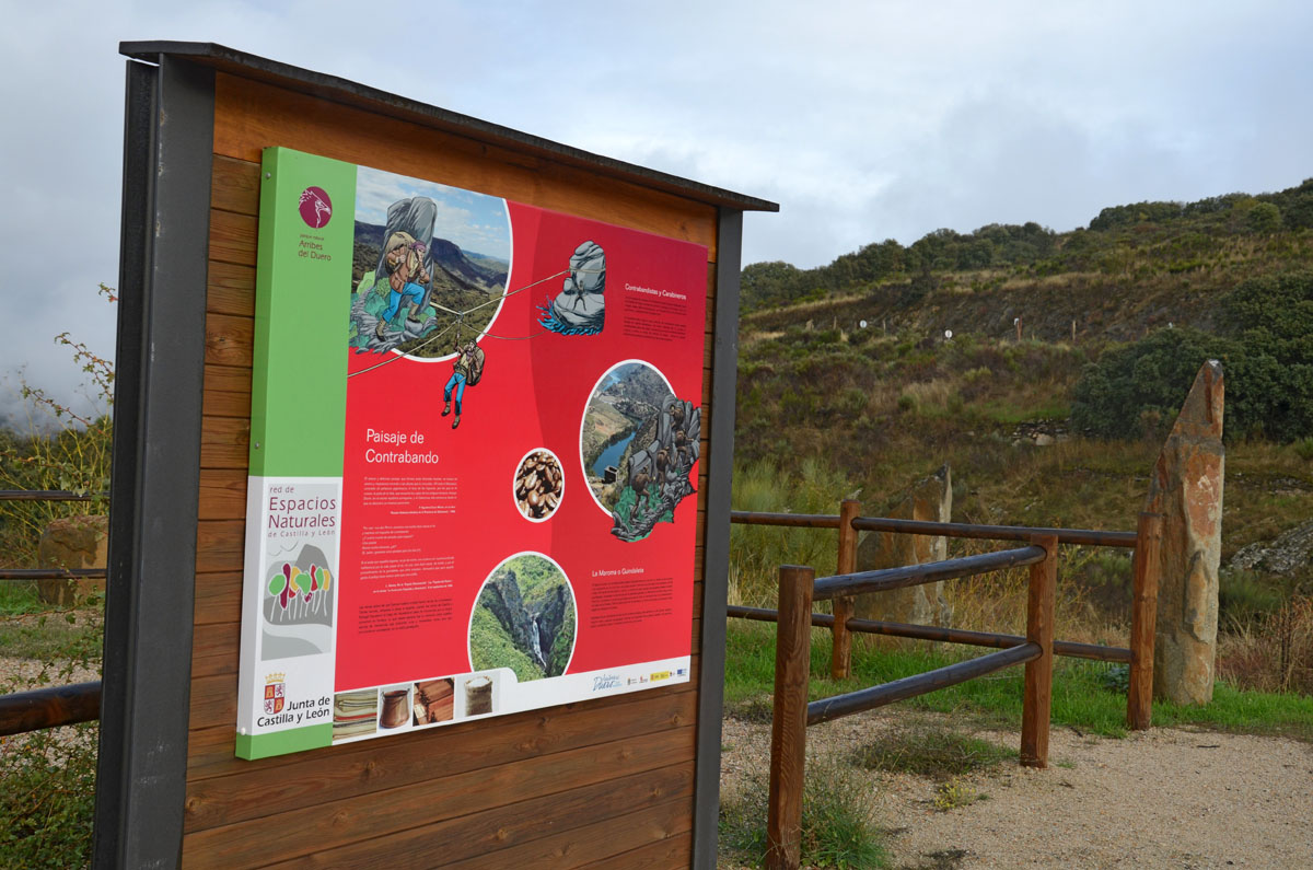 En el tramo de carretera que lleva a Saucelle, antes de pasar la frontera por la presa de este nombre, debemos parar en el Mirador del Contrabando. Dicen los folletos, que pertenece a la red «Paisajes de Las Arribes. Ruta de los Miradores», creado por el Plan de Dinamización Turística de la Zona Sur de Las Arribes. Pero eso es casi lo menos importante.