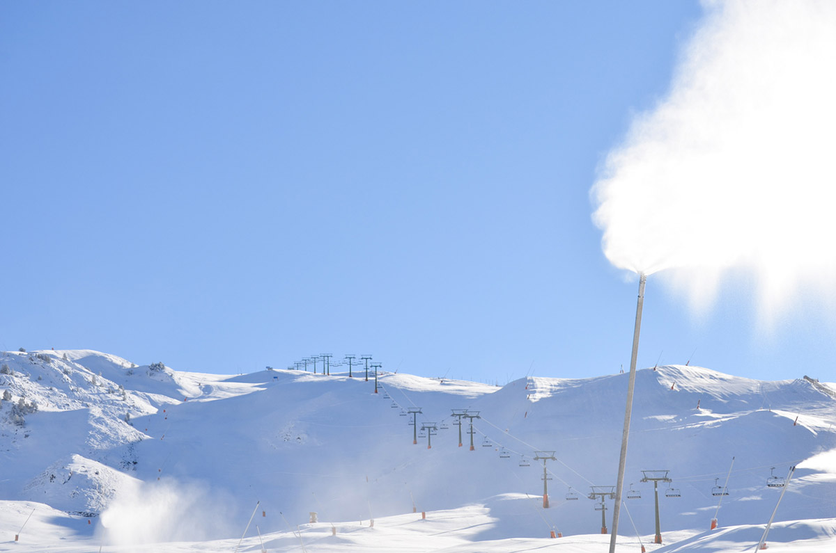 Son cañones de última generación y tienen una gran eficacia de producción en días de viento, gracias a su potente ventilador que hace que la nieve producida se optimice al máximo cayendo sobre la pista más húmeda, lo que ayuda a que no se la lleve el viento. En esta apuesta por la sostenibilidad, en algunas zonas se ha sembrado hierba para asegurar una mejor conservación del manto de nieve en invierno.